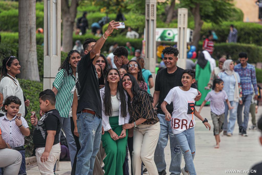 شباب يلتقطون الصور خلال الاحتفال بعيد شم النسيم في حديقة الأزهر في القاهرة