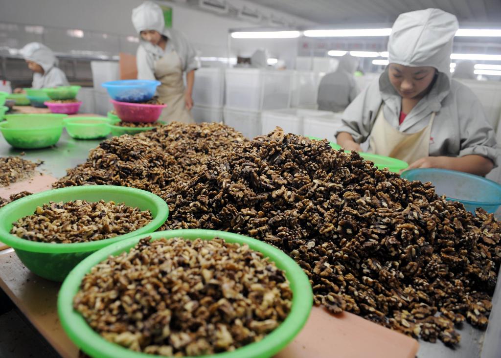 في ورشة معالجة الجوز التابعة لشركة روييو المحدودة للأغذية في مدينة فنيانغ بمقاطعة شانشي بشمالي الصين، يشتغل عشرات العاملين في أعمال تقشير الجوز وفرزه ووضع الملصقات عليه وتعبئته لتجهيزه للتصدير خارج البلاد.