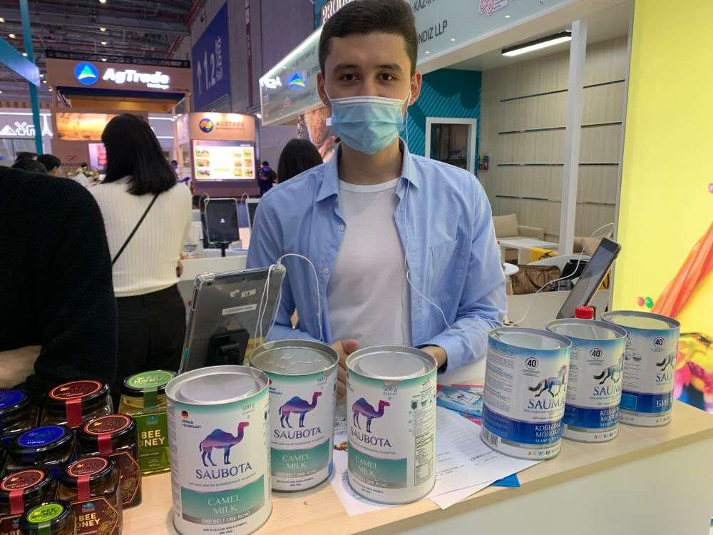 في الصورة الملتقطة يوم 5 نوفمبر 2020 ، مخانبت، شاب قازاقي (26 عاما) يتحدث باللغة الصينية إلى التجار والزوار لتسويقمنتجات حليب الإبل المجفف لشركته.تاريخ الحدث: 9 نوفمبر 2020لا يزال الجمل، بدوره الحيوان المساعد القوي للبشرية في نقل الركاب وتوصيل البضائع وسط الصحراء خاصة على طريق الحرير القديم، يشهد التبادلات التجارية المكثفة بين الصين والدول على الحزام والطريق، وذلك من خلال تقديم منتجات حليب الإبل المميزة.في الصورة الملتقطة يوم 5 نوفمبر 2020 ، باو تشانغ فنغ، رئيس غرفة تجارة ييوو في الإمارات يسوقمن